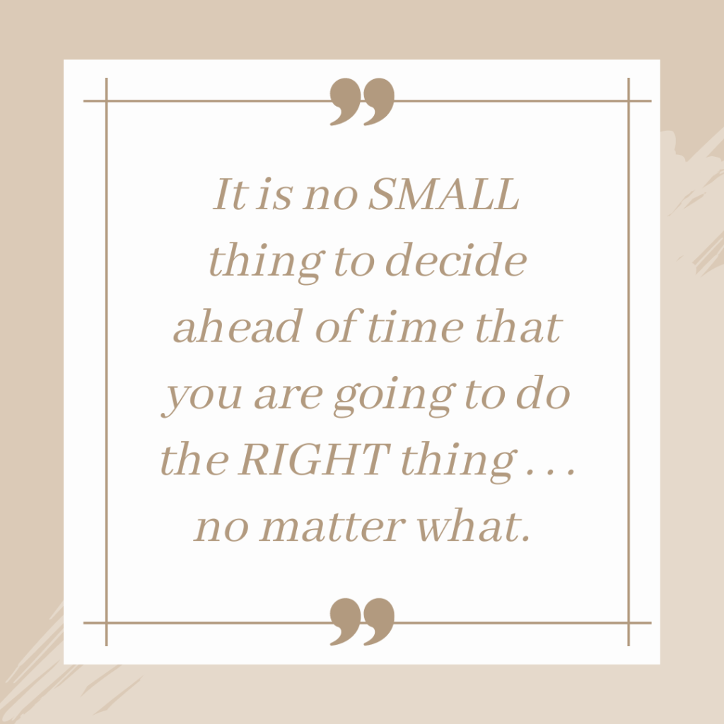 When we can take everything that we’ve been taught and decide ahead of time that, regardless of external forces in the form of people or circumstances, we are determined to do the right thing no matter what . . . we can know for sure that “mental and moral qualities distinctive to an individual” have been internalized.